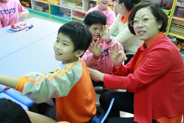 ▲基金会执行理事长刘景萍女士带领孩子们做手工
